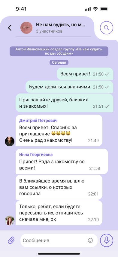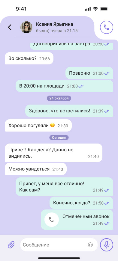 Conversations made simple. Messages are grouped clearly by sender and date. Sent, delivered, and read statuses are marked with ticks. The color palette keeps focus on content while being easy on the eyes.